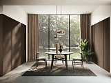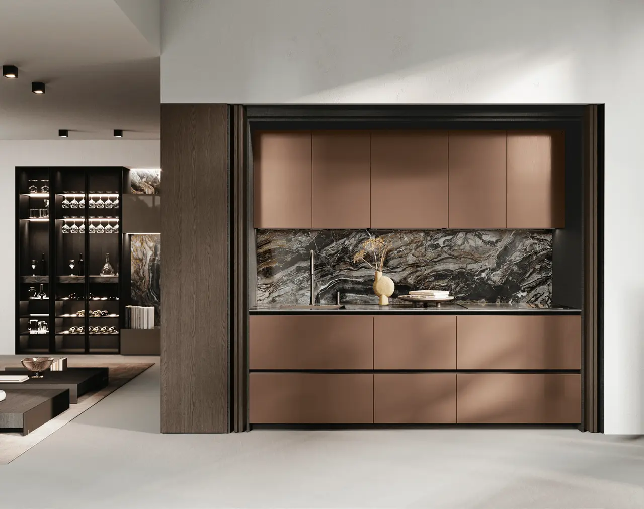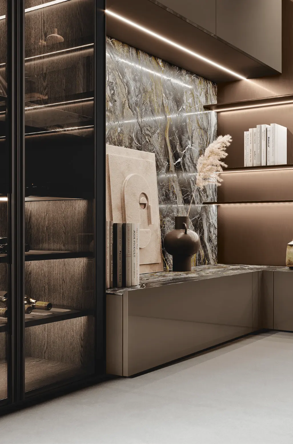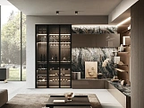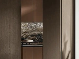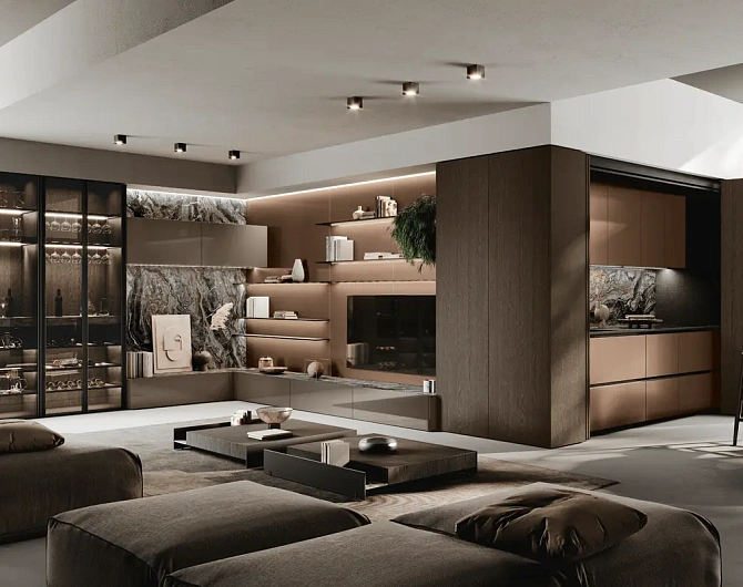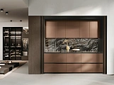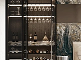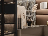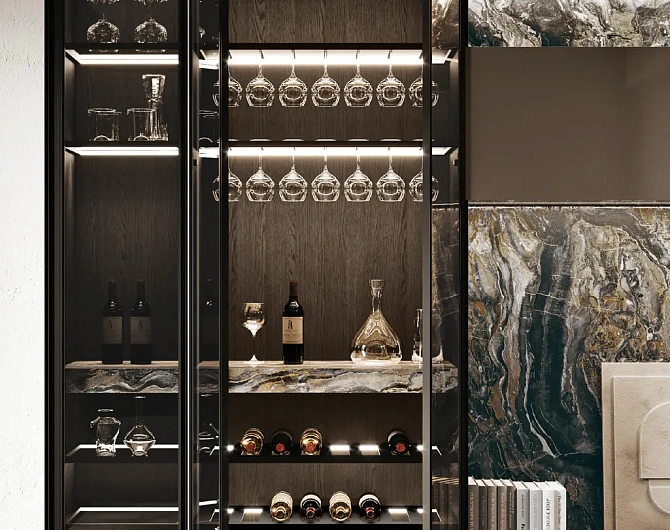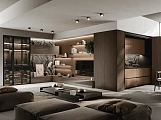 В первой зоне справа расположен уголок для отдыха, образованный витринами с функцией бара. Далее следуют низкие глянцевые лакированные тумбы с системой зенит и стеновые панели с листовым узором и ступенчатыми полками. Стена продолжается колоннами, переходящими в кухонную зону со скрытыми дверями, что позволяет ей сливаться в единое линейное и плавное пространство. Завершает композицию буфет.