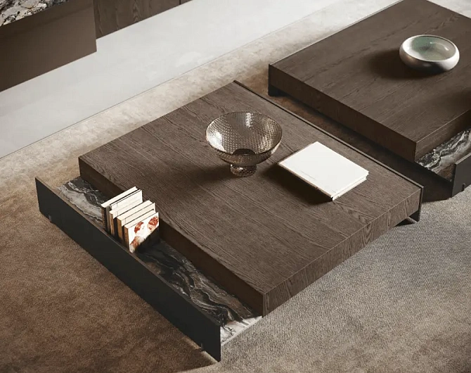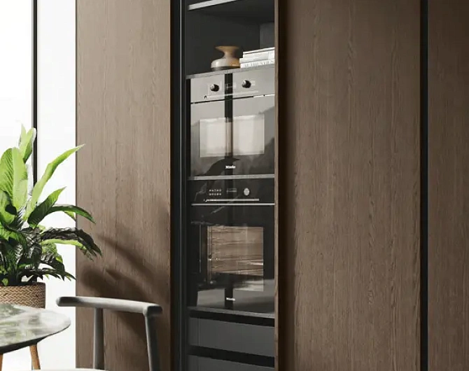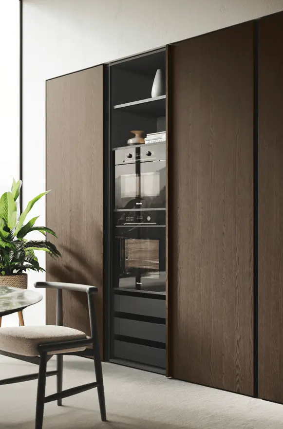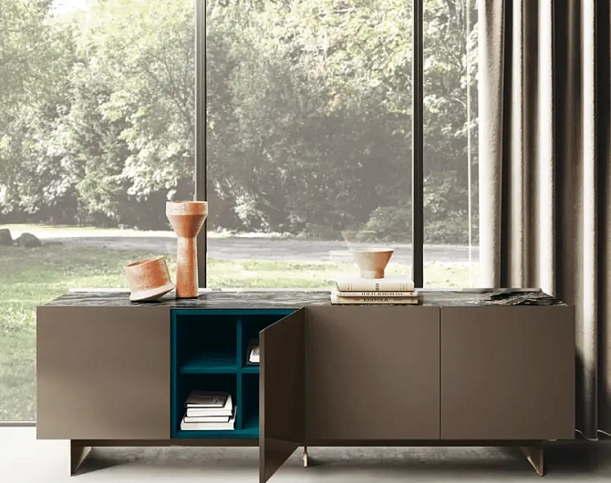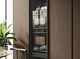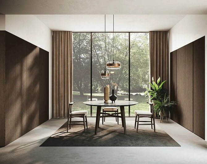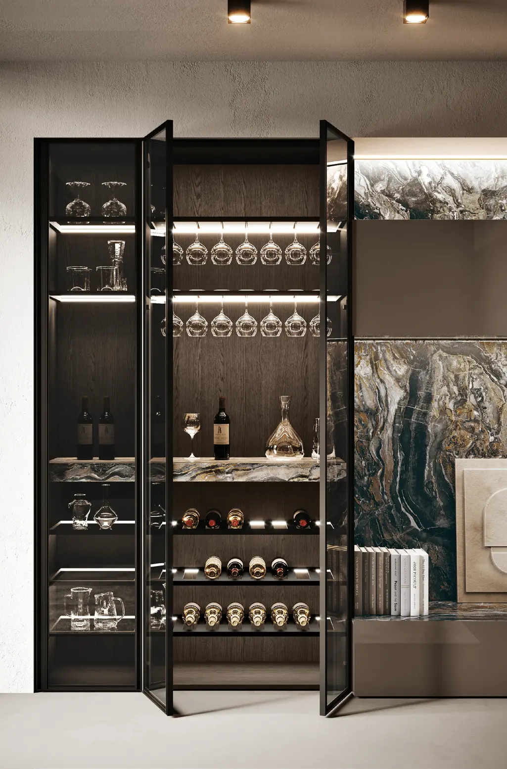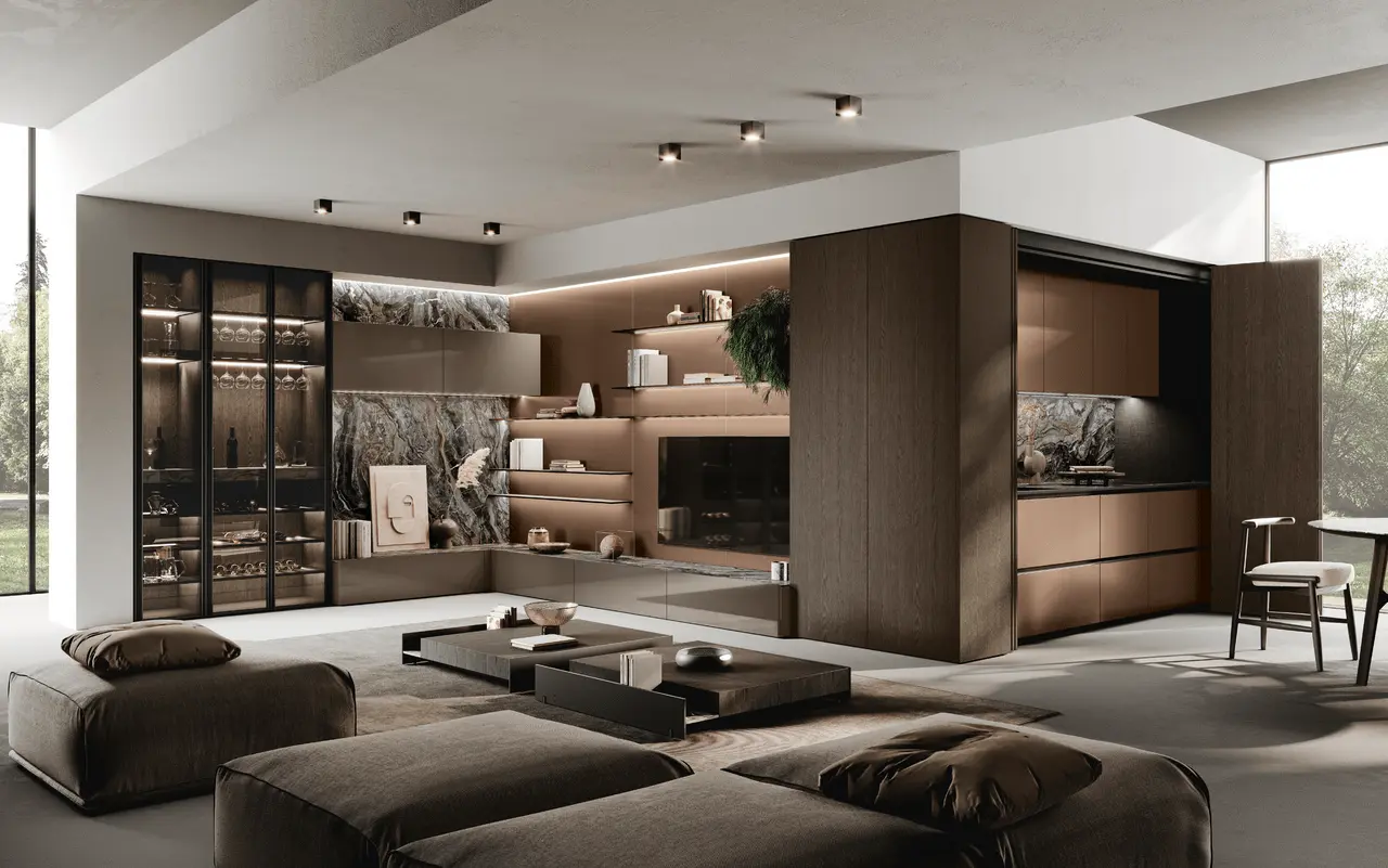 В первой зоне справа расположен уголок для отдыха, образованный витринами с функцией бара. Далее следуют низкие глянцевые лакированные тумбы с системой зенит и стеновые панели с листовым узором и ступенчатыми полками. Стена продолжается колоннами, переходящими в кухонную зону со скрытыми дверями, что позволяет ей сливаться в единое линейное и плавное пространство. Завершает композицию буфет.