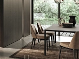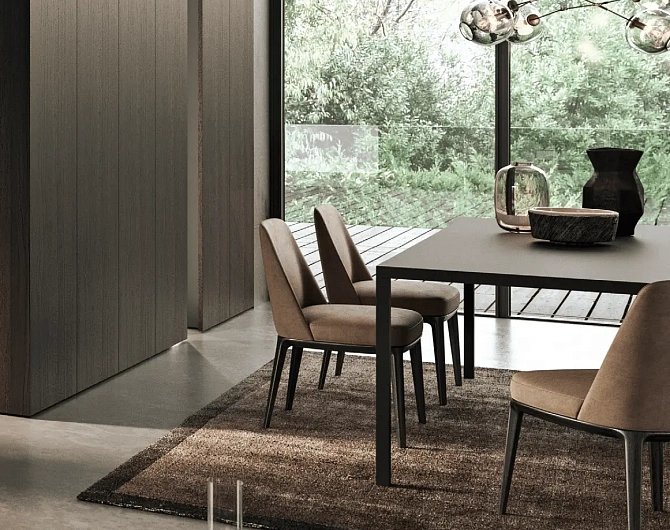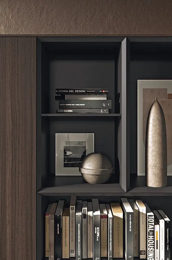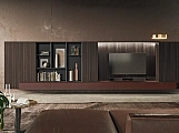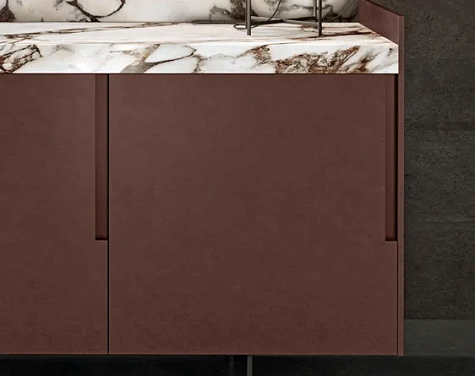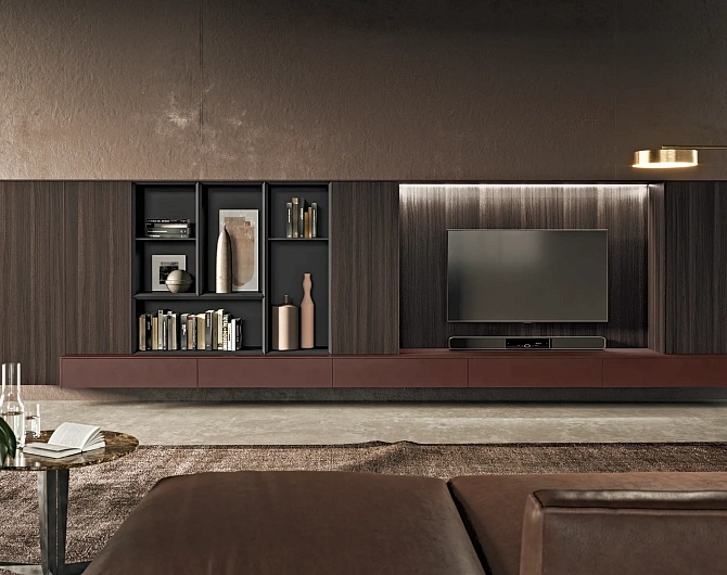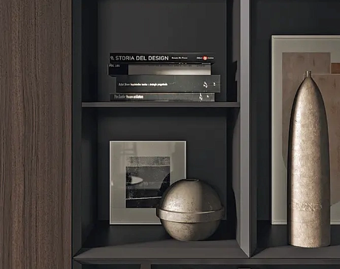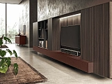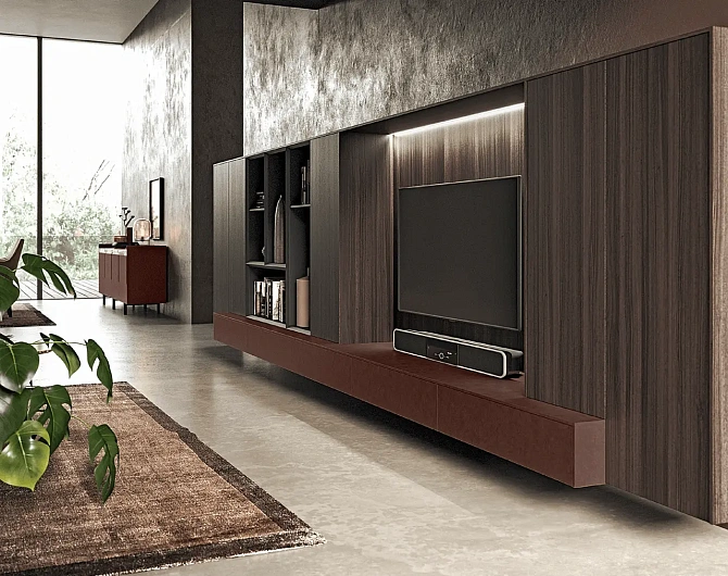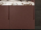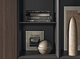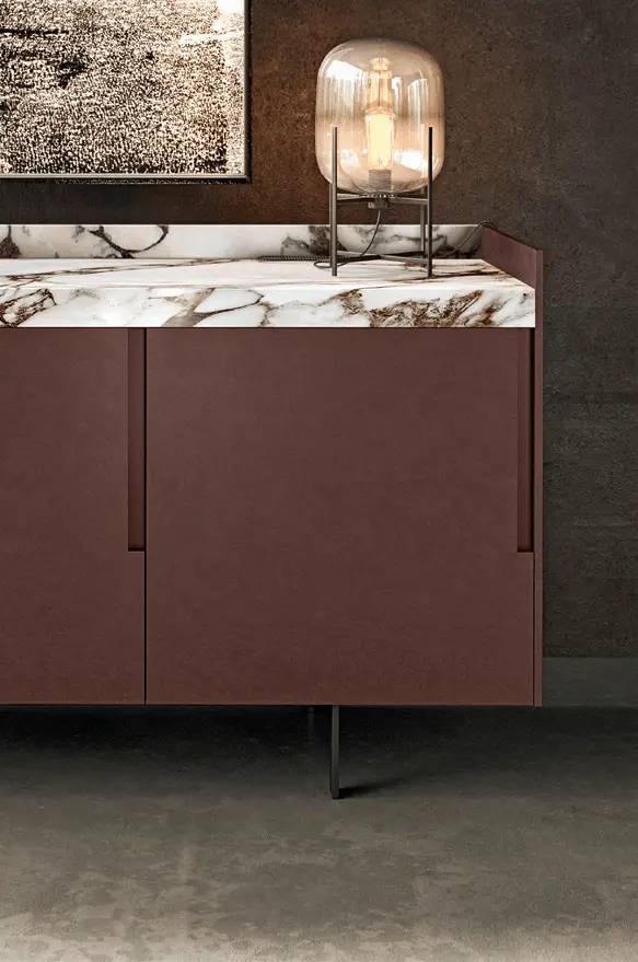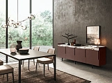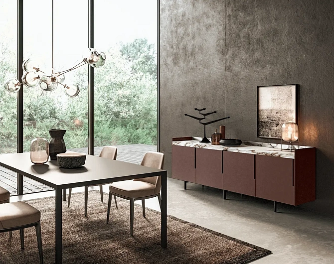 Буфет с дверцами Vogue отличается вертикальными разрезами, которые позволяют открывать их, и металлическим лакированным покрытием 4.0. Гостиная стена повторяет те же отделки, что и кухня, и характеризуется пересечением объёмов, создающих полные и пустые пространства со встроенными складными открытыми секциями, в то время как буфет имеет дверцы Vogue и столешницу из толстого керамогранита.