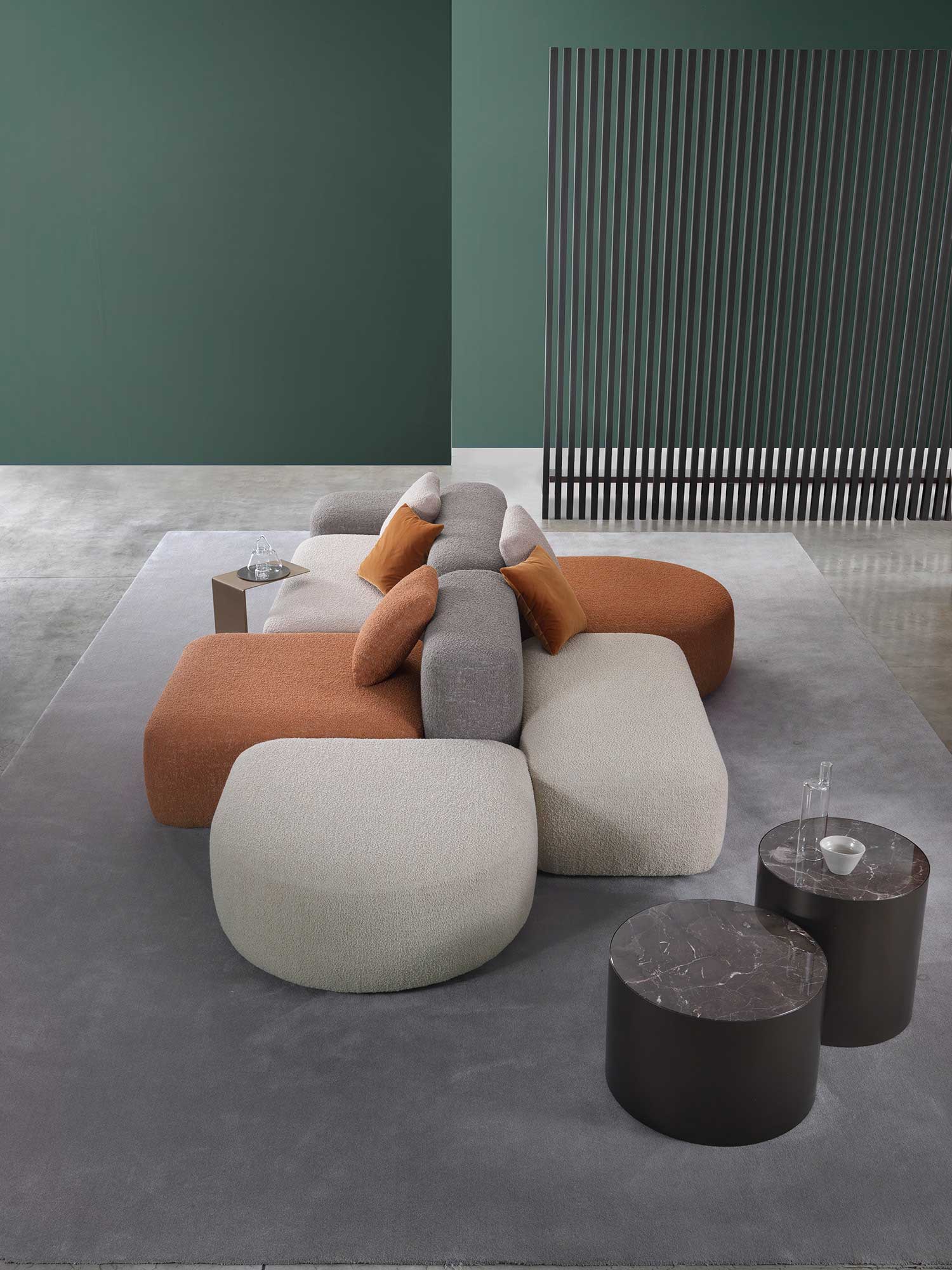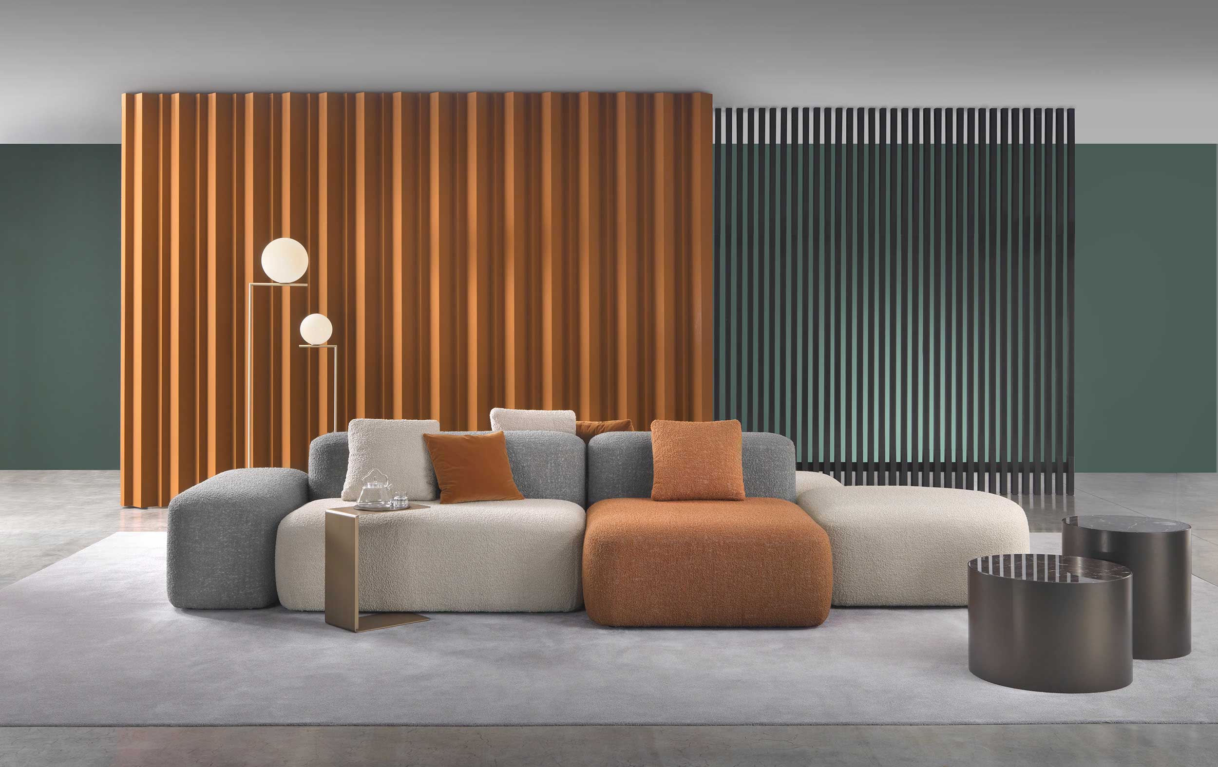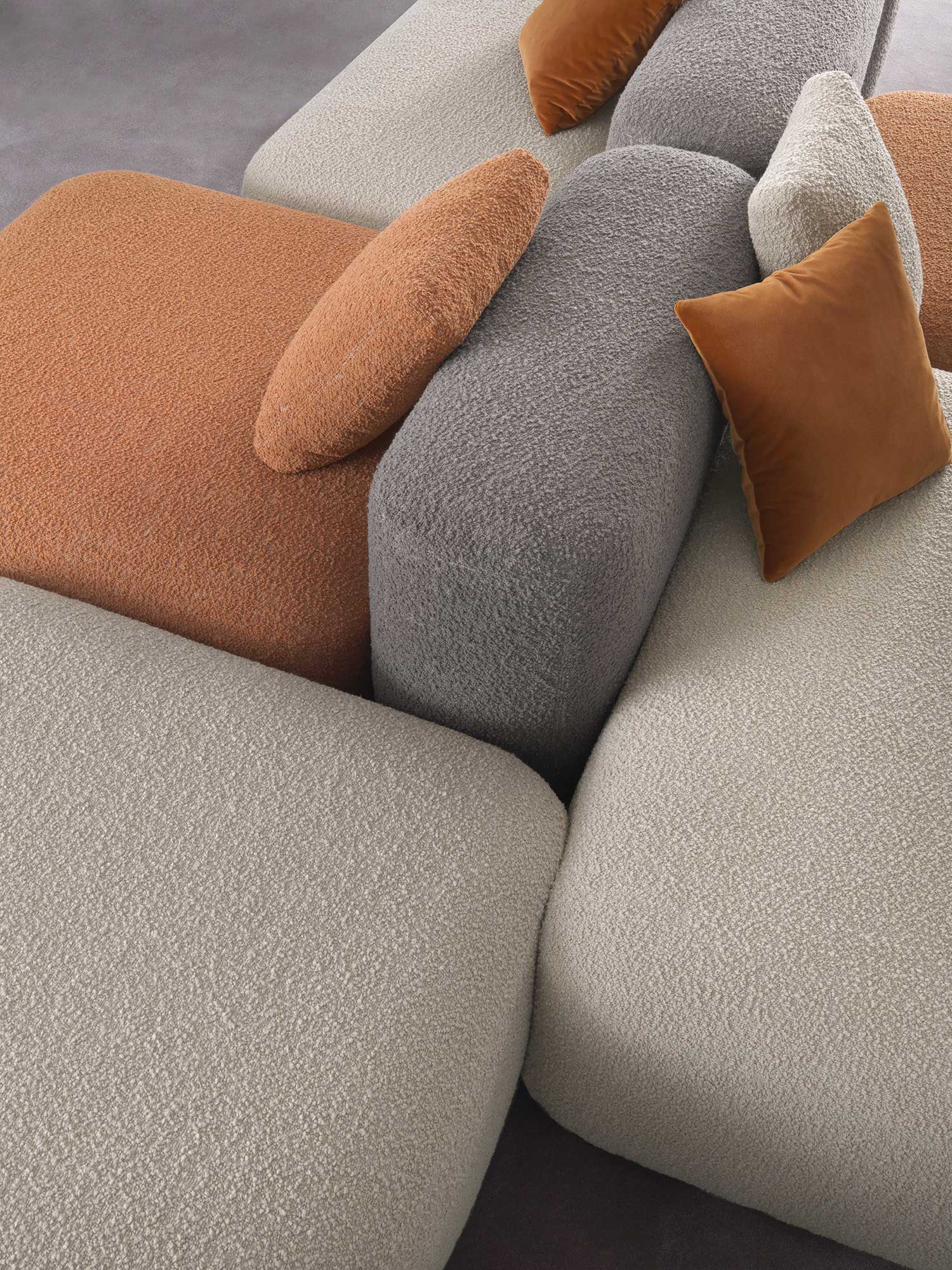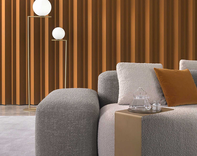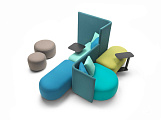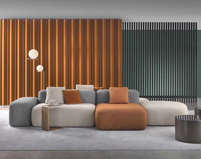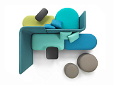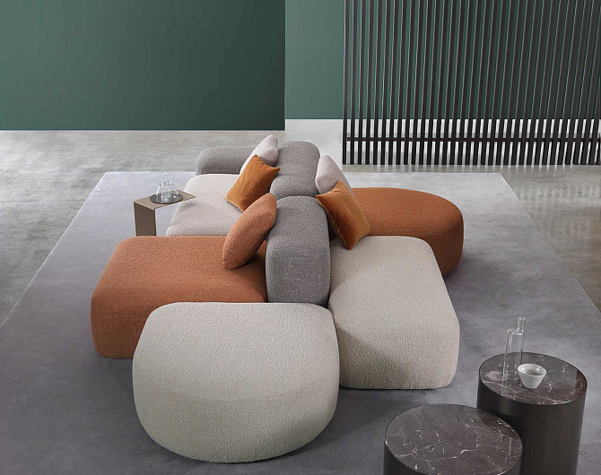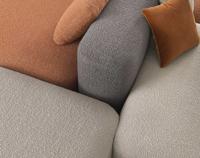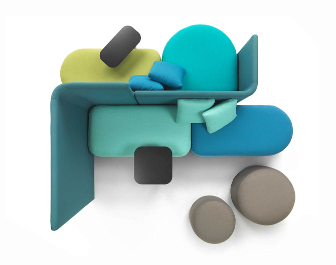 Дизайн системы отличается мягкими, приглашающими формами, которые создают атмосферу уюта и комфорта. Особое внимание уделено визуальной составляющей: использование цветных тканей и различных текстур придает изделию игривый характер и создает живую, динамичную атмосферу в любом пространстве.