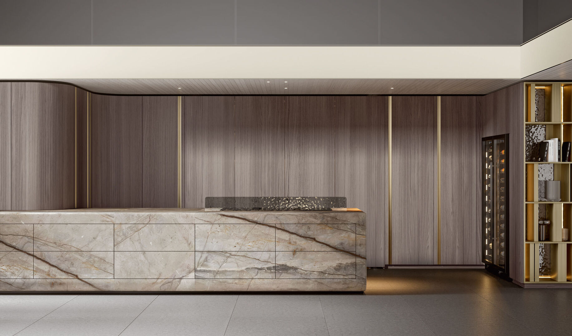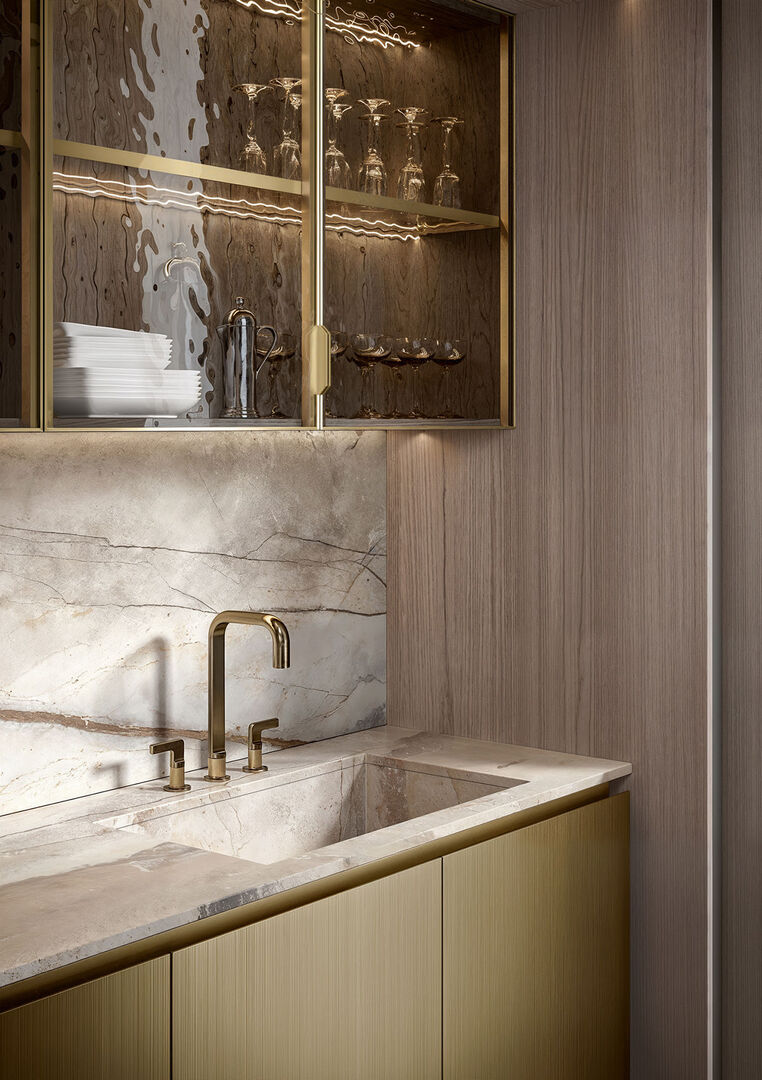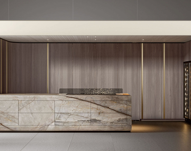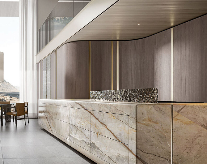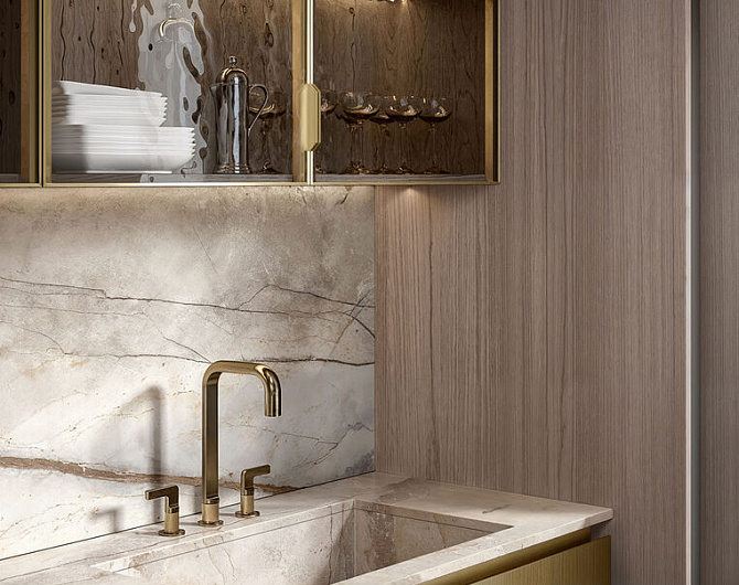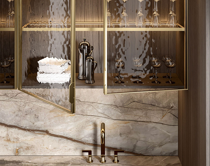 Отделка: дуб с оттенком Nebula, мрамор Silver Roots и бронзовая полосатая текстура