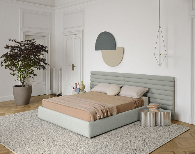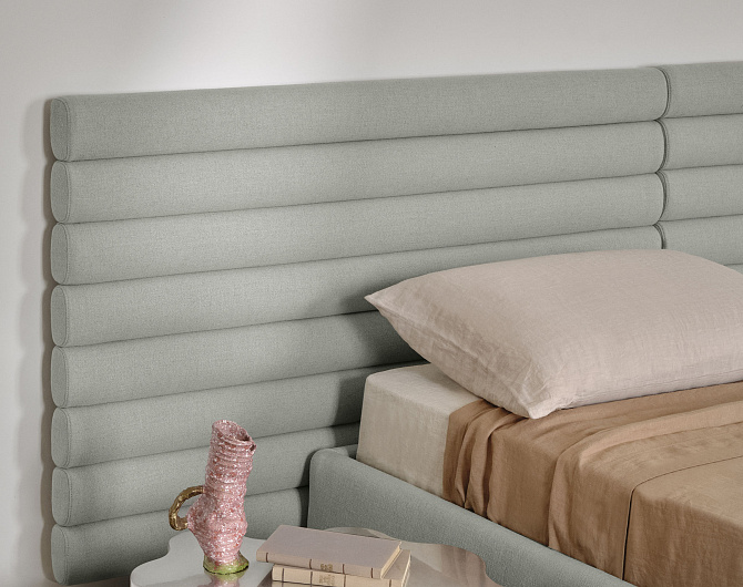 Дизайн изголовья разработан по принципу буазери — декоративной стеновой отделки, где круглые объемы формируют уникальный текстурный рисунок. Эта особенность позволяет не просто украсить стену, но и создать на ней оригинальное художественное полотно, превращающее обычную спальню в произведение искусства.