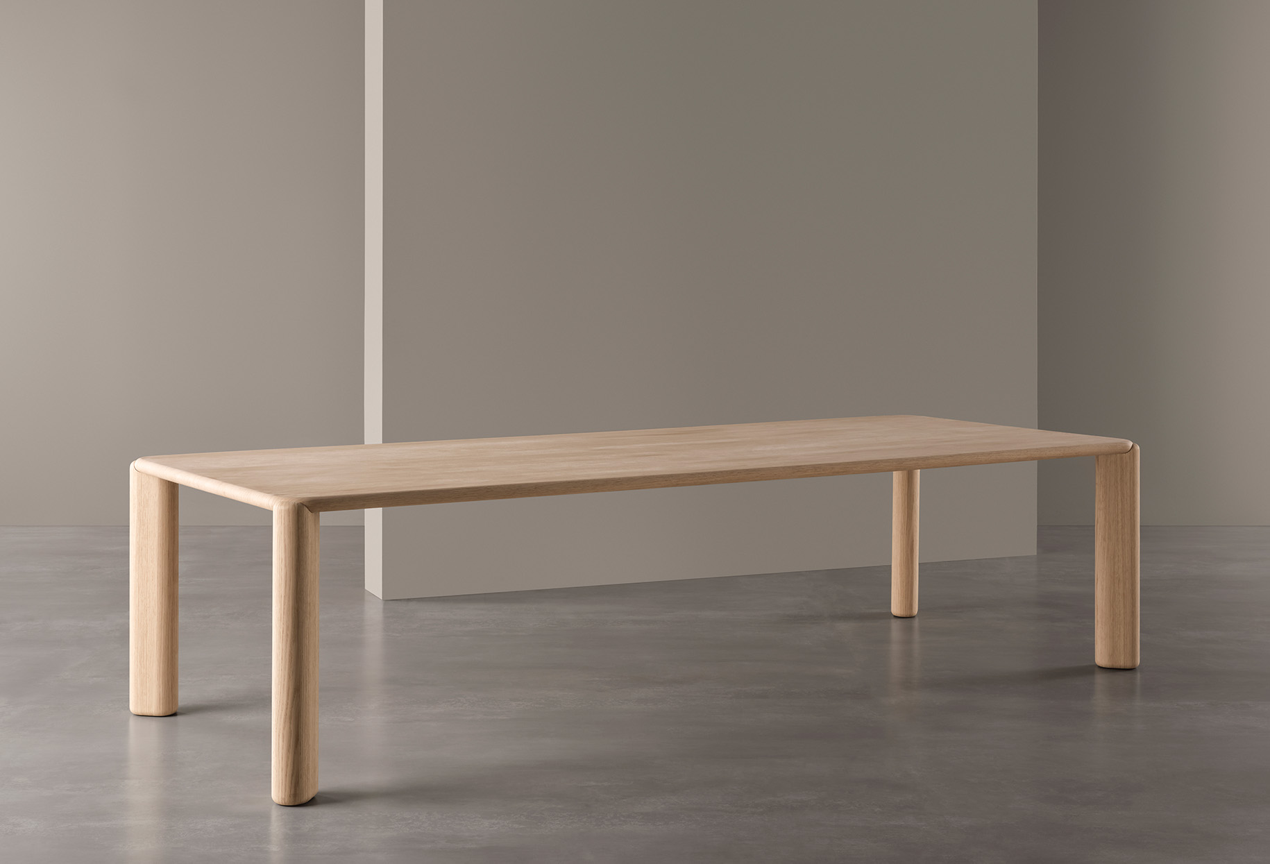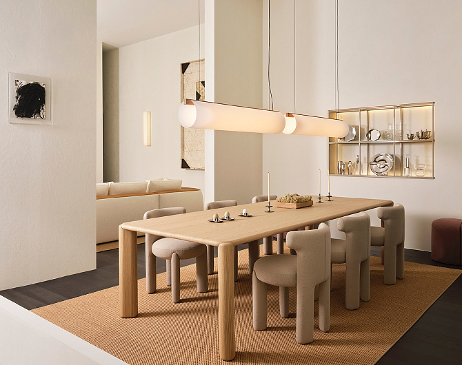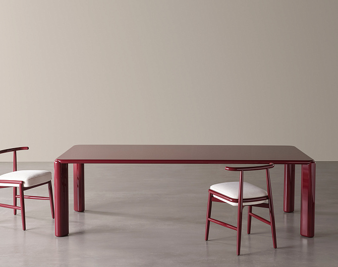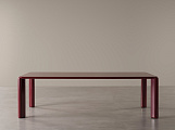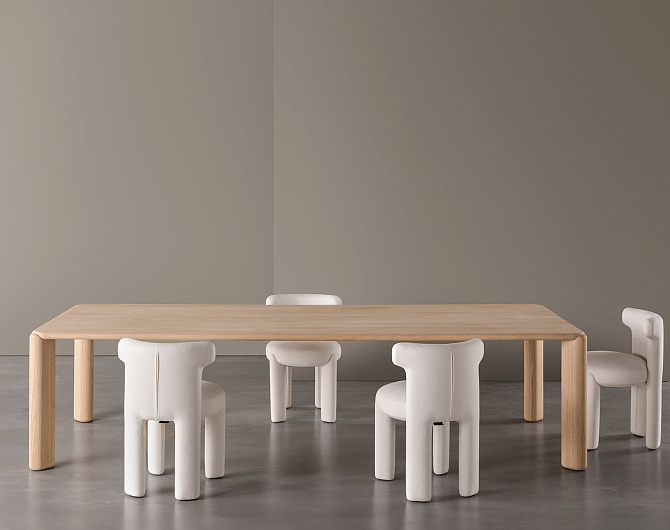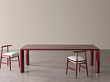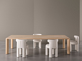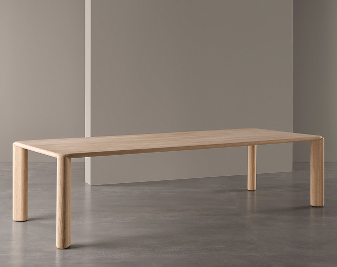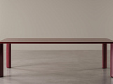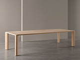 Дизайн ножек характеризуется утонченными, вытянутыми формами, придающими столу особую грацию и визуальную легкость. Коллекция представлена в трех прямоугольных форматах, причем максимальная длина стола достигает впечатляющих трех метров, что делает его идеальным решением как для небольших пространств, так и для просторных помещений.
